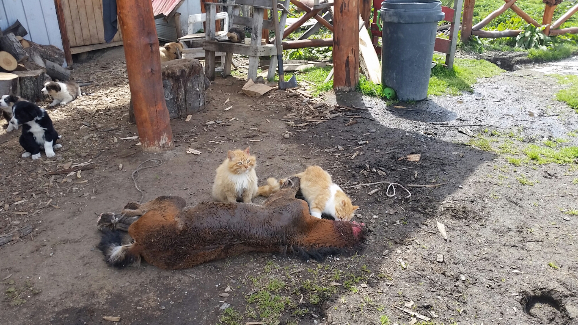 Hungry cats who are more friendly than they look (note that the carcass they are lunching on was found in the forest, already having passed due to natural causes and not harmed by any members of the Estancia).